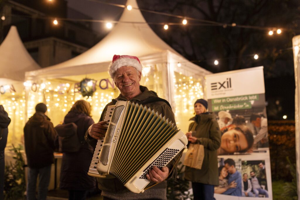 Im Schlossgarten gibt es außerdem mehrere Stände, an denen Gefüchtete und Initiativen neben Heißgetränken auch arabisches Fingerfood, Süßes und die Möglichkeit anbieten, ins Gespräch zu kommen.