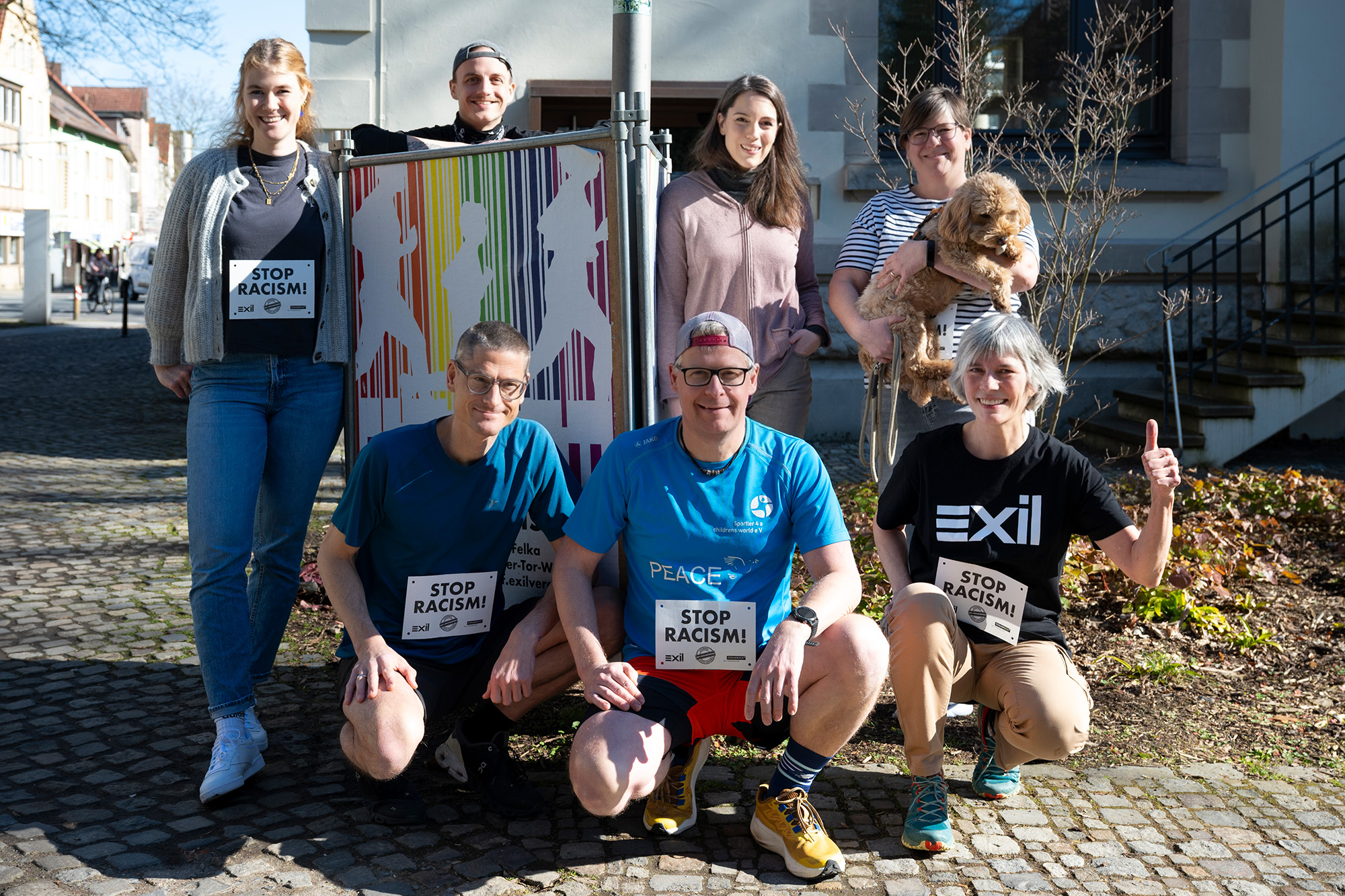 Gemeinsam ein Zeichen setzen: Das Orga-Team von Exil e.V. und Unterstützer*innen des „Laufs gegen Rassismus“ versammeln sich mit der vierbeinigen Botschafterin Winnie vor dem Café Felka am Museumsquartier Osnabrück. Foto: Angela von Brill